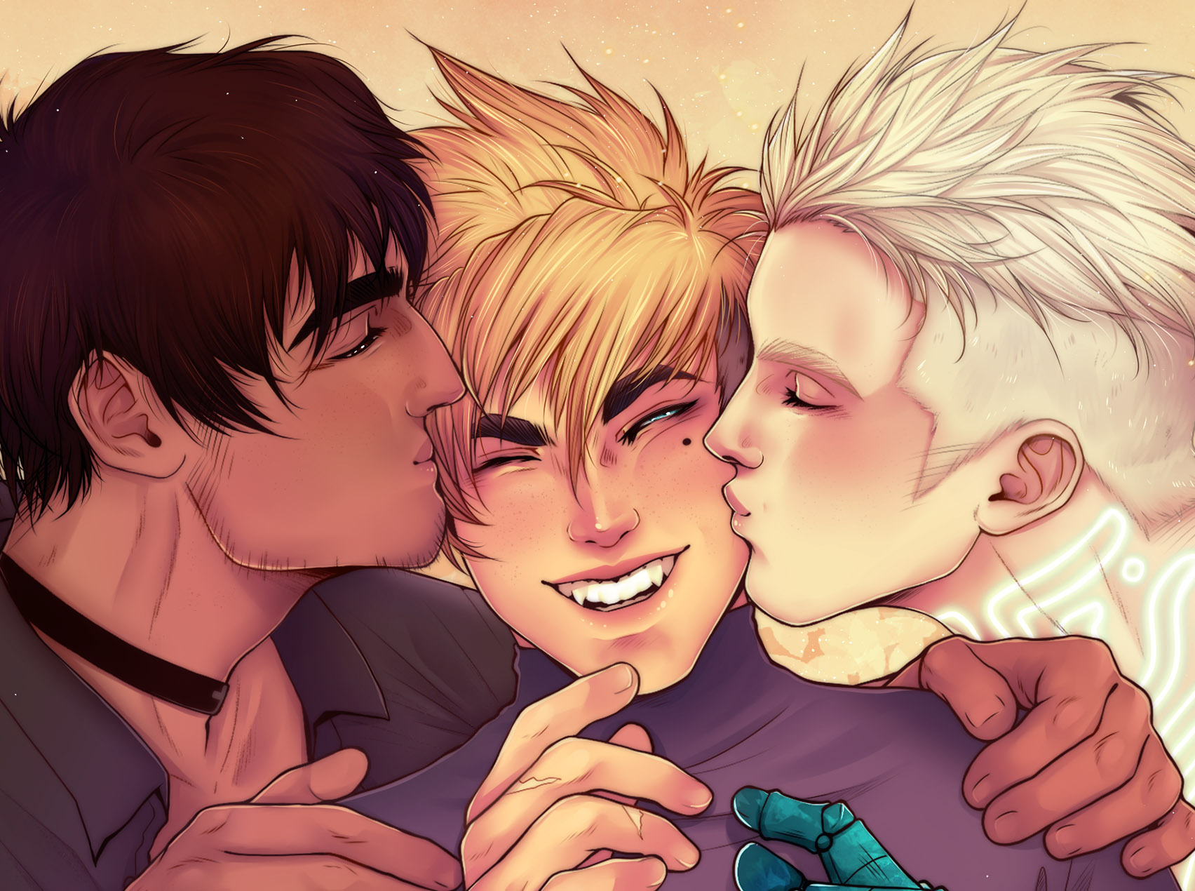 High quality PEARLY print of Wolfwood, Vash and Knives from Trigun being "friendly" for once. A5, 300mg, pearly, round corner (5,83 x 8,27 inches)