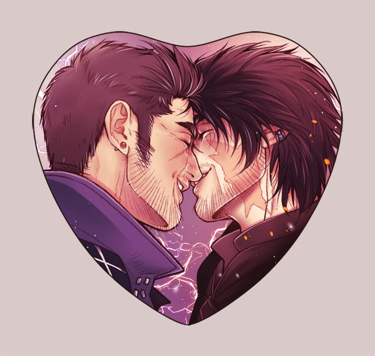 Heart shaped FFXVI button with Cid and Clive with holographic effect. 53*57mm